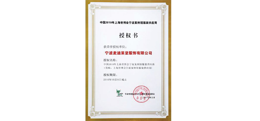 Apparel Supplier for the Ningbo Pavilion at the Shanghai World Expo Mediladen is honored to serve as the apparel supplier for the Ningbo Pavilion at the Shanghai World Expo.